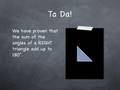 Description: This slide show shows how to prove that the sum of the angles of a triangle is 180 degrees. |